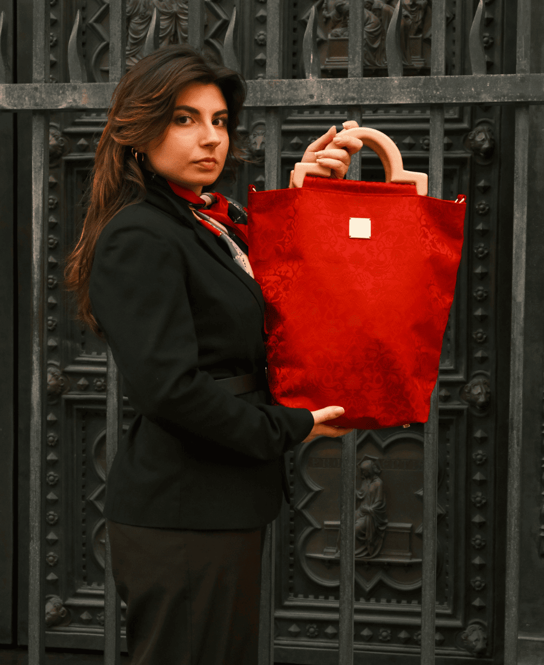 La borsa Firenze racchiude in sé arte, simbolismo e architettura: nasce dall'unione tra il damasco storico dell'Antico Setificio Fiorentino e un manico in legno ispirato alla Porta Nord del Battistero di San Giovanni, vero gioiello dell'arte fiorentina.