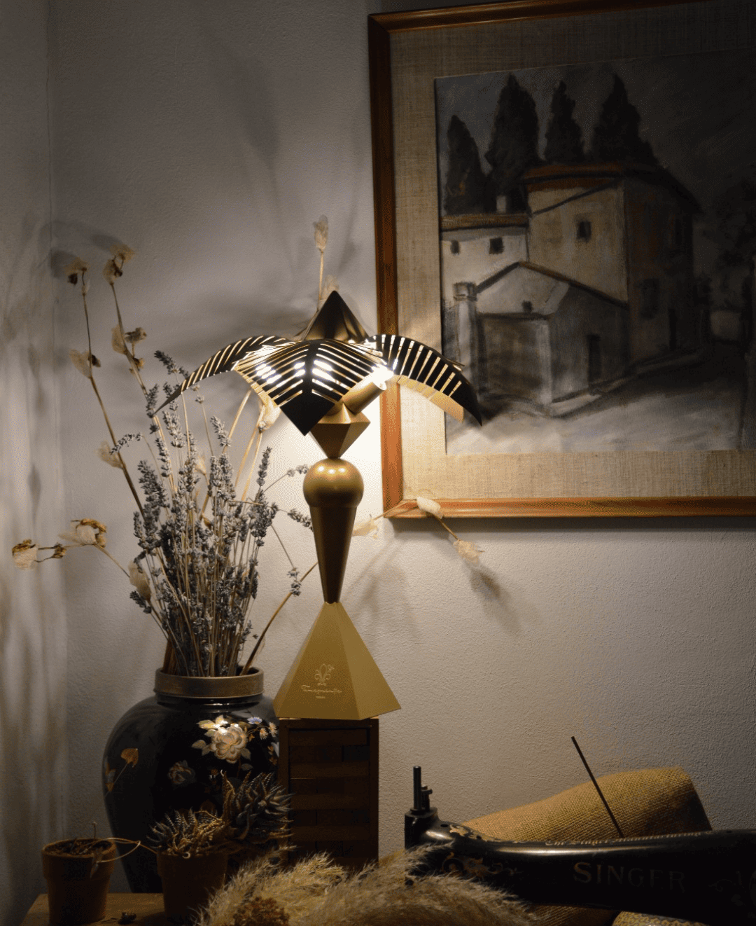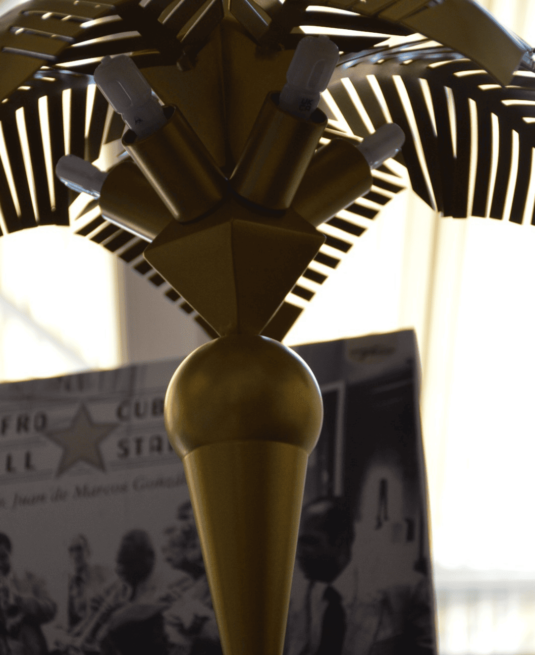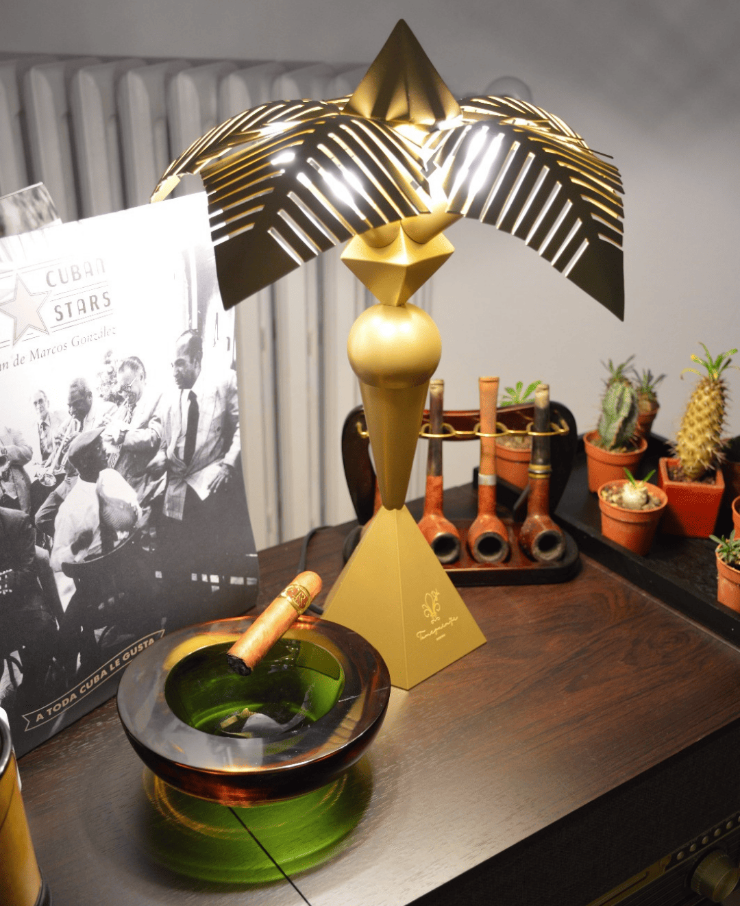 Attraverso un raffinato gioco di geometrie e prospettive, la lampada rivela significati diversi a seconda del punto di osservazione. A prima vista, la sua forma richiama la slanciata eleganza della palma reale, pianta nazionale di Cuba. Ma osservandola dall'alto, le cinque foglie che compongono il paralume disegnano una stella. Guardando le singole foglie, si coglie infine l'omaggio alle foglie del habano, il sigaro cubano per eccellenza, rinomato in tutto il mondo.